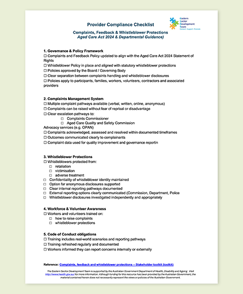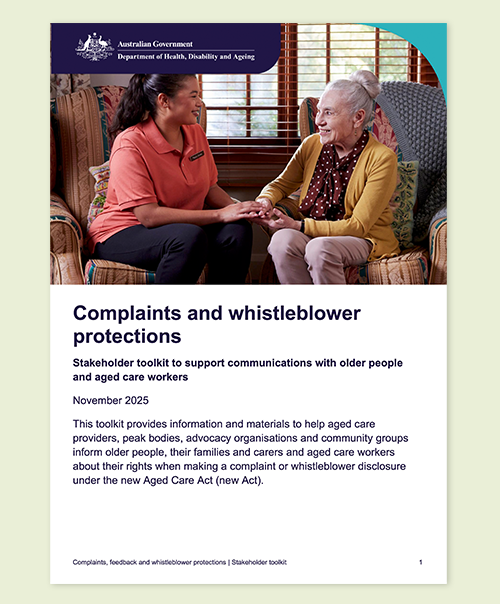 This toolkit provides information and materials to help aged care providers communicate with older people, their families and carers and workers about their rights when making a complaint or whistleblower disclosure.