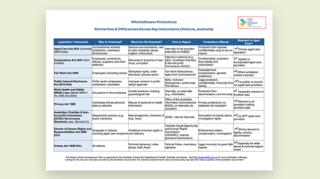 A comparison of whistleblower protections across key Victorian and Australian laws relevant to aged care.